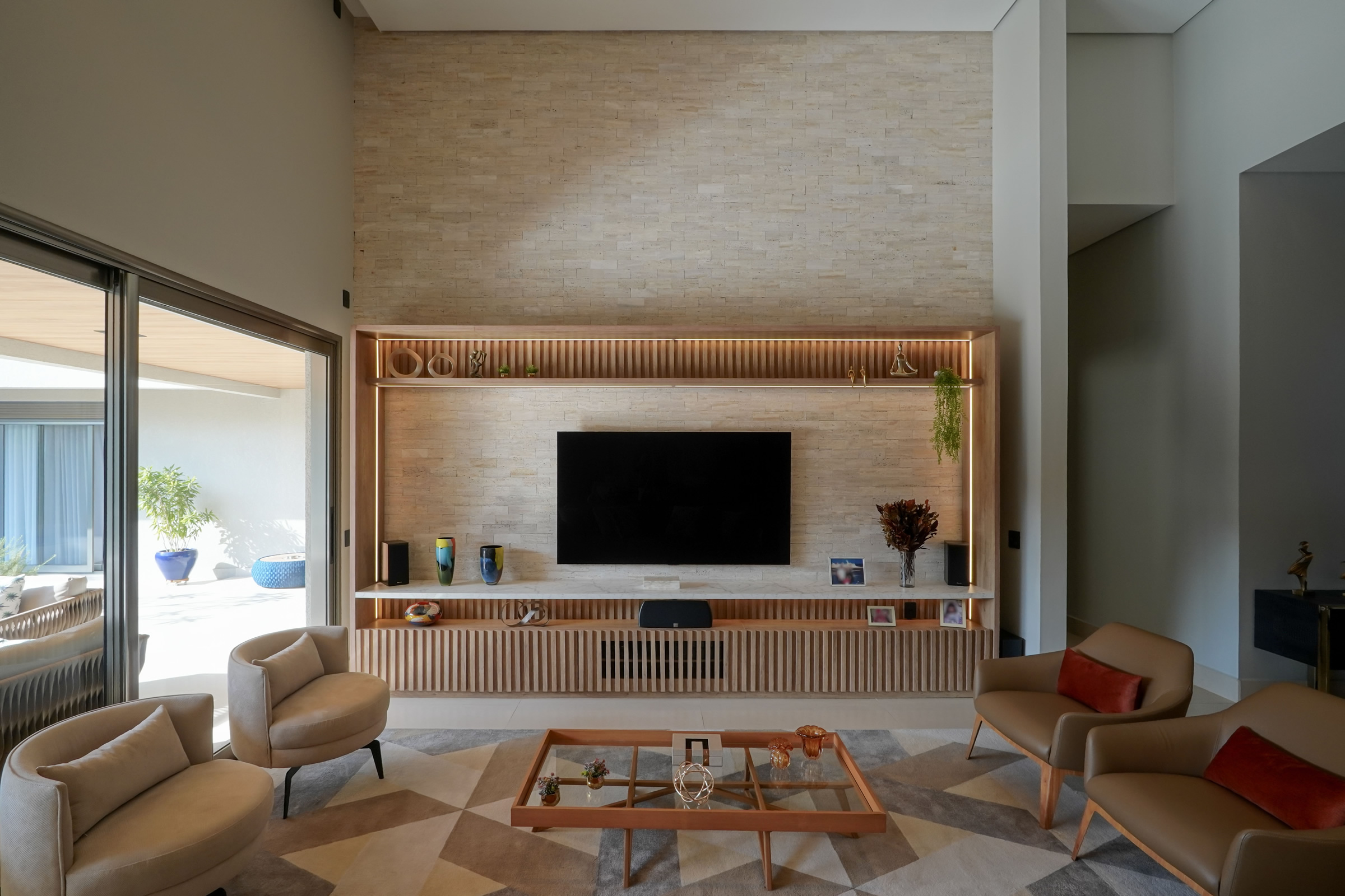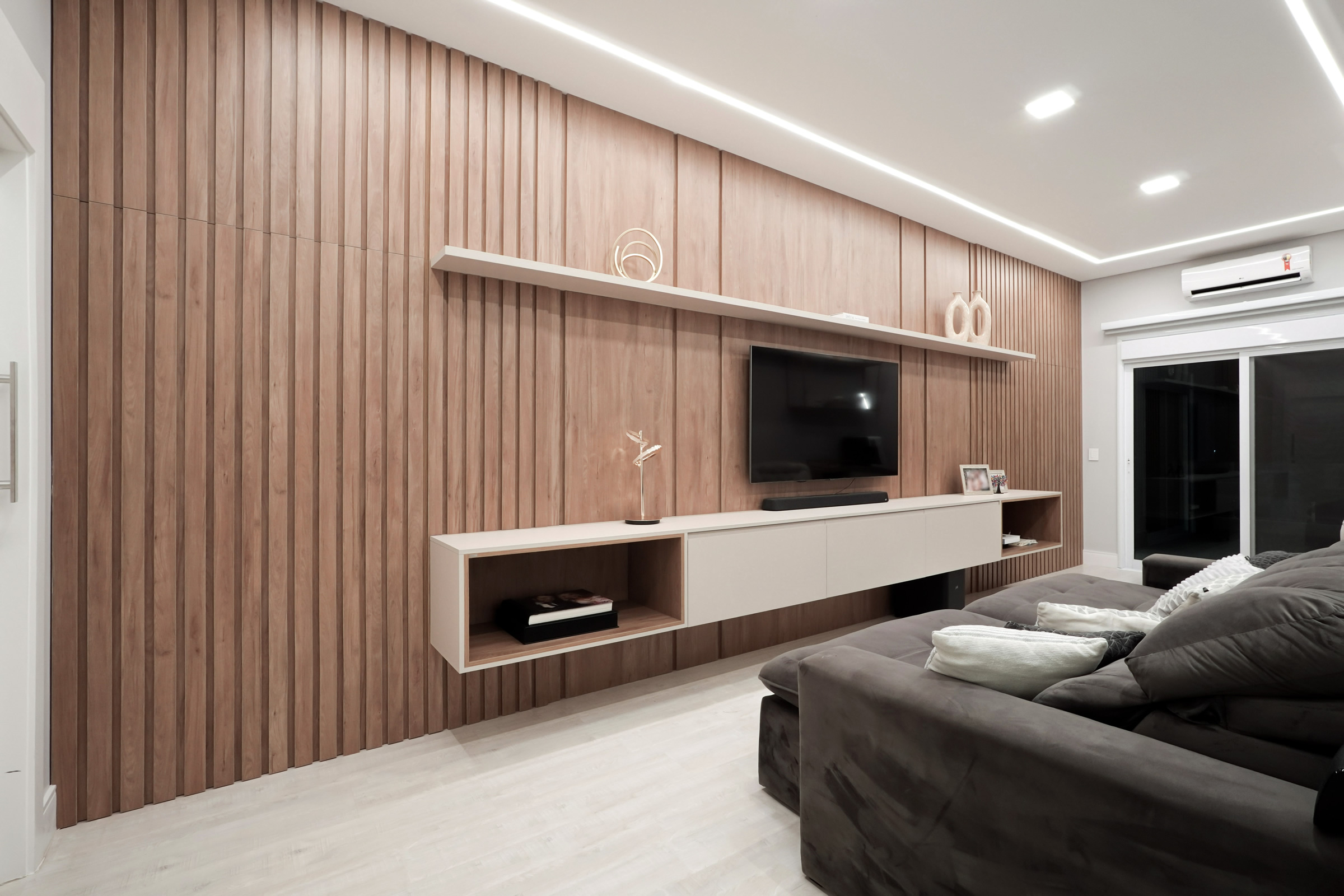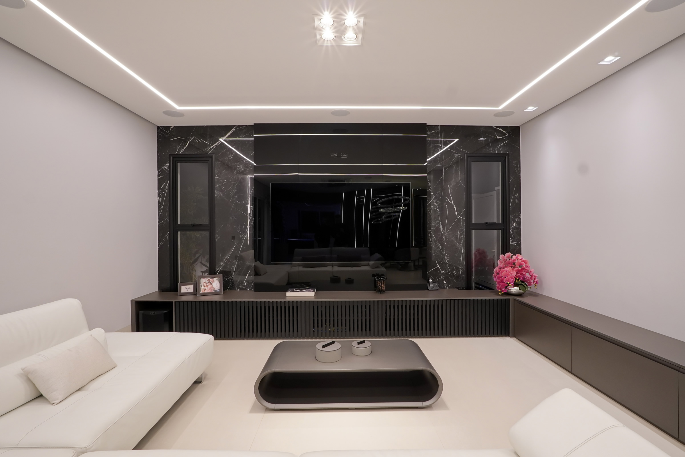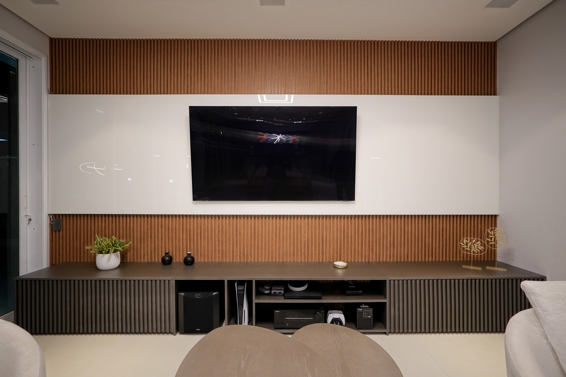 Nosso compromisso com os detalhes e o uso de materiais de alta qualidade, incluem painéis com sistema System, que ocultam todos os fios, portas ripadas para esconder os equipamentos e iluminação indireta, garantindo que seja um ambiente especial e acolhedor.