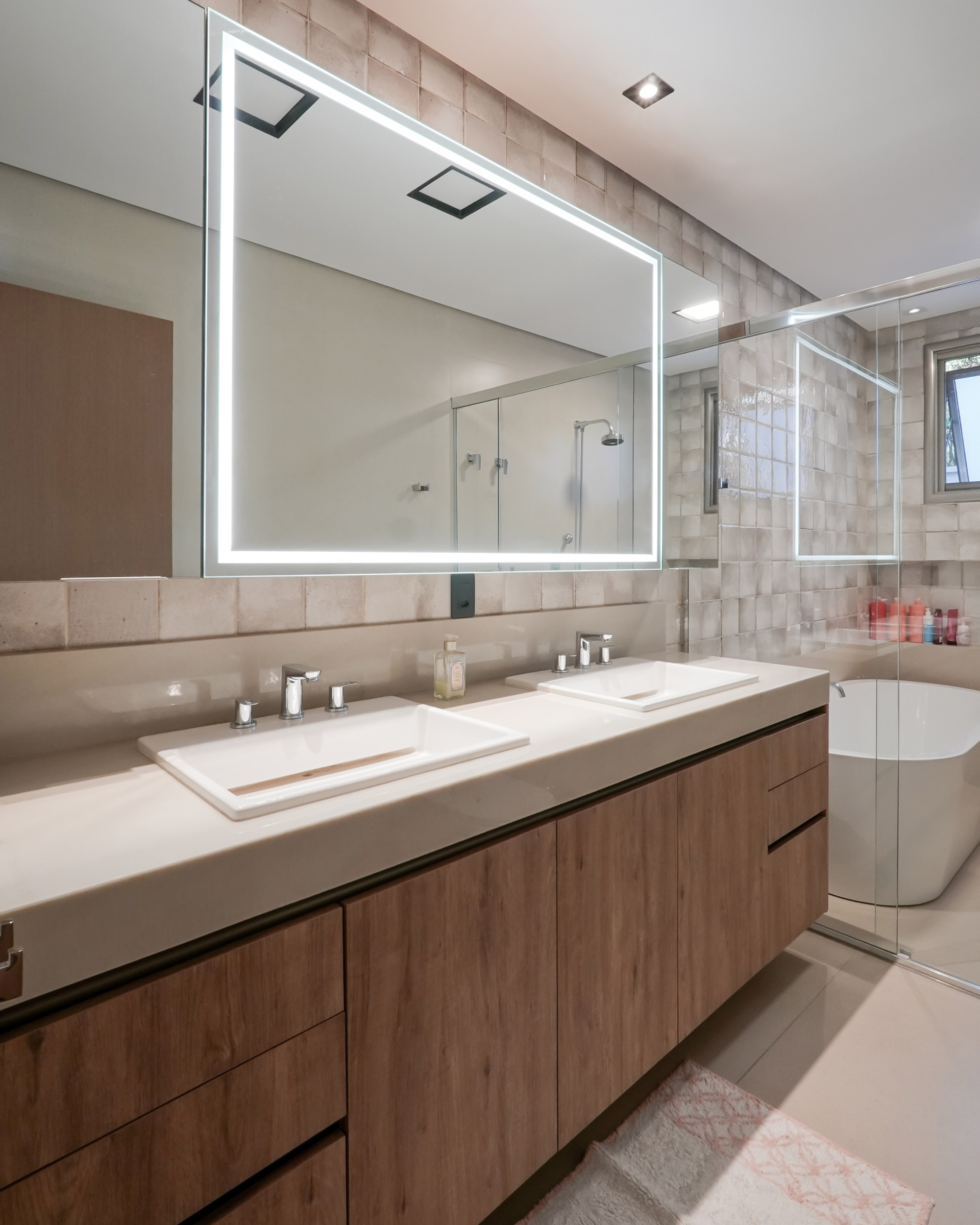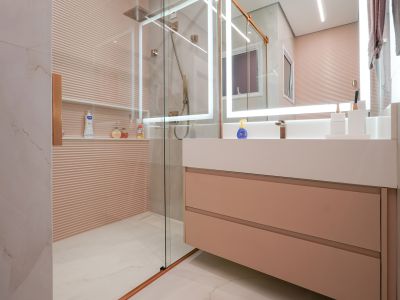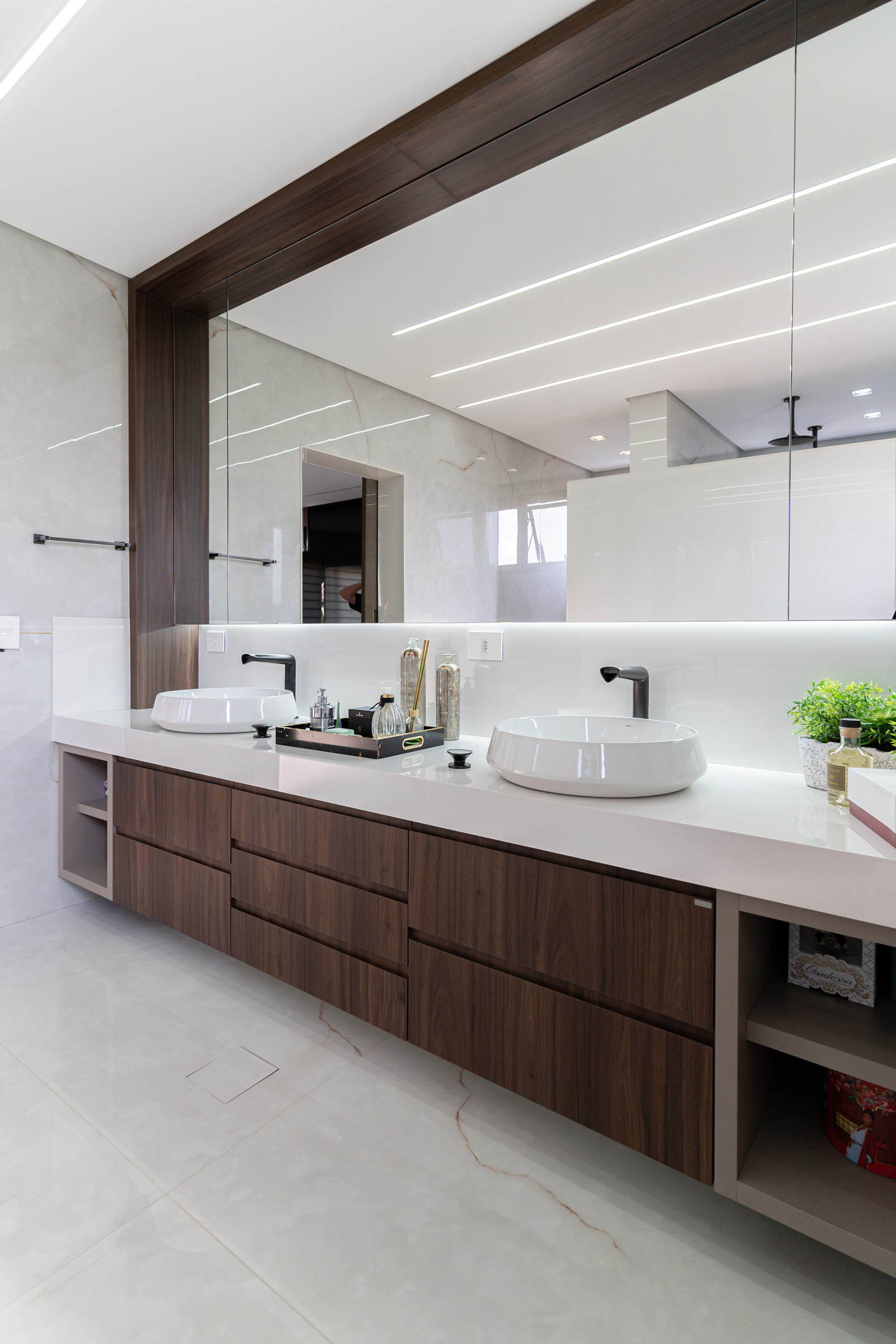 Desde armários elegantes e espelhos com iluminação integrada, cada elemento é projetado para proporcionar uma experiência de spa em casa. Utilizamos os melhores materiais e técnicas de design para garantir que seu banheiro seja tanto funcional quanto sofisticado, oferecendo um ambiente harmonioso para seus momentos de cuidado pessoal.