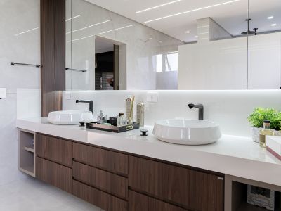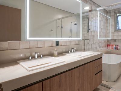 Desde armários elegantes e espelhos com iluminação integrada, cada elemento é projetado para proporcionar uma experiência de spa em casa. Utilizamos os melhores materiais e técnicas de design para garantir que seu banheiro seja tanto funcional quanto sofisticado, oferecendo um ambiente harmonioso para seus momentos de cuidado pessoal.